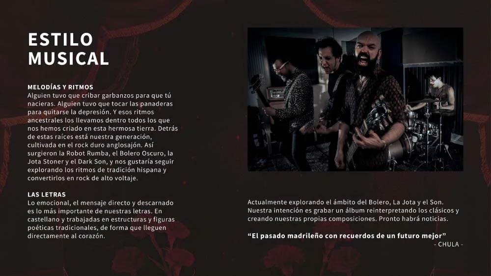 Esta banda madrileña nació con una propuesta única: fusionar boleros con rock oscuro, guitarras pesadas y sintetizadores del averno. Necesitaban una imagen (y un nombre) que reflejara su estilo único y les posicionara dentro del panorama musical.
